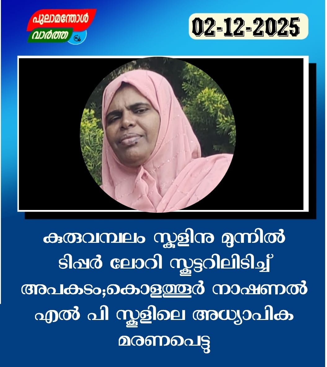 കുരുവമ്പലം സ്കുളിനു മുന്നിൽ ടിപ്പർ ലോറി സ്കൂട്ടറിലിടിച്ച് അപകടം;കൊളത്തൂർനാഷണൽ ഹൈസ്‌കൂളിലെ അധ്യാപിക മരണപെട്ടു
