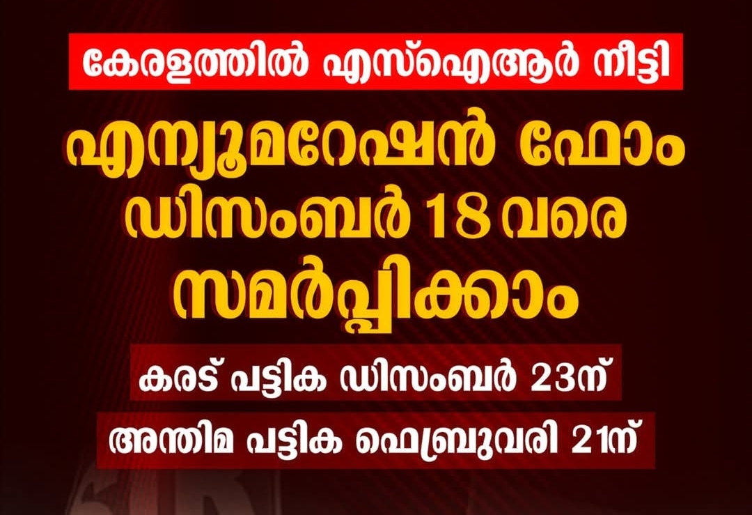കേരളത്തിൽ എസ്ഐആർ നീട്ടി; 18 വരെ എന്യൂമറേഷൻ ഫോം സ്വീകരിക്കും; ഫെബ്രുവരിയിൽ അന്തിമ വോട്ടർ പട്ടിക